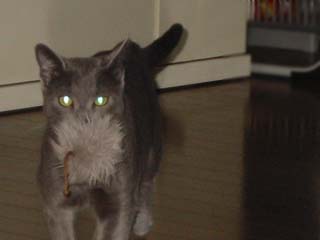 2003/12/27 口元の毛が 長くなったわけでは ありません。 おもちゃをくわえて 持ってくるところです。 |