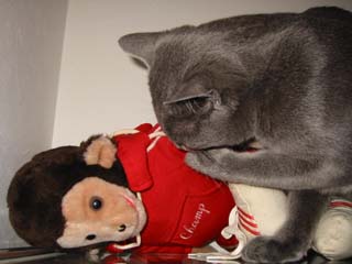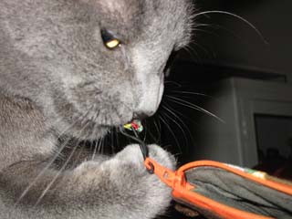2004/2/19 デジカメ入れの ポーチについている 飾りが気になるらしい。 |