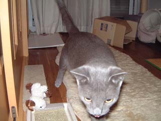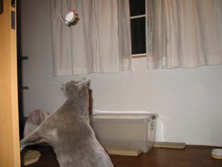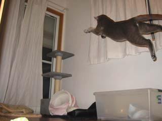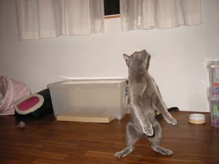 2004/4/14 誕生日です。 無事に1歳になりました。 これは投げたねずみの おもちゃを ジャンプして取る図 |